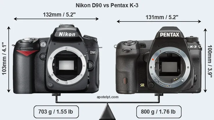 An illustration of the physical size and weight of the Nikon D90 and the Pentax K-3 is provided in the side-by-side display below. The two cameras are presented according to their relative size. Three consecutive perspectives from the front, the top, and the back are available. All size dimensions are rounded to the nearest millimeter.