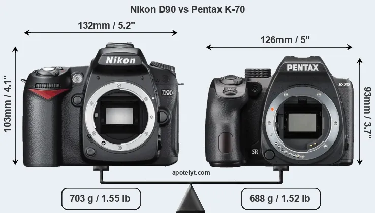 An illustration of the physical size and weight of the Nikon D90 and the Pentax K-70 is provided in the side-by-side display below. The two cameras are presented according to their relative size. Three consecutive views from the front, the top, and the rear side are shown. All width, height and depth measures are rounded to the nearest millimeter.