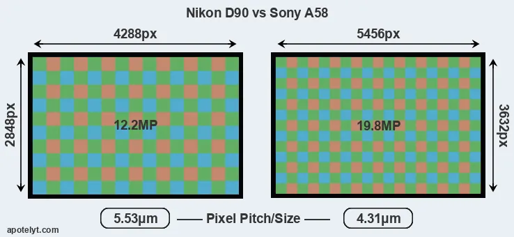 Despite having a slightly smaller sensor, the A58 offers a higher resolution of 19.8 megapixels, compared with 12.2 MP of the D90. This megapixels advantage comes at the cost of a higher pixel density and a smaller size of the individual pixel (with a pixel pitch of 4.31μm versus 5.53μm for the D90). However, it should be noted that the A58 is much more recent (by 4 years and 5 months) than the D90, and its sensor will have benefitted from technological advances during this time that make it possible to gather light more efficiently.