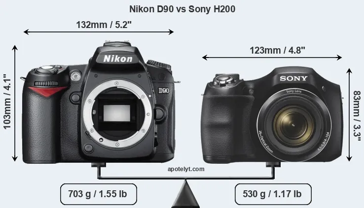 An illustration of the physical size and weight of the Nikon D90 and the Sony H200 is provided in the side-by-side display below. The two cameras are presented according to their relative size. Three consecutive perspectives from the front, the top, and the back are available. All size dimensions are rounded to the nearest millimeter.