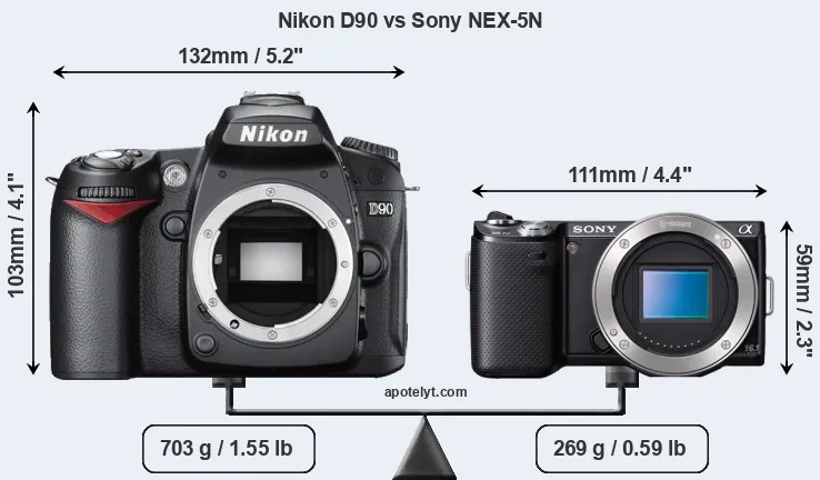 An illustration of the physical size and weight of the Nikon D90 and the Sony NEX-5N is provided in the side-by-side display below. The two cameras are presented according to their relative size. Three consecutive perspectives from the front, the top, and the back are available. All size dimensions are rounded to the nearest millimeter.