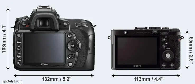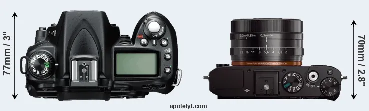 The physical size and weight of the Nikon D90 and the Sony RX1 are illustrated in the side-by-side display below. The two cameras are presented according to their relative size. Three successive views from the front, the top, and the rear are shown. All width, height and depth dimensions are rounded to the nearest millimeter.