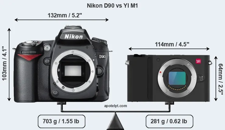 The side-by-side display below illustrates the physical size and weight of the Nikon D90 and the YI M1. The two cameras are presented according to their relative size. Three consecutive perspectives from the front, the top, and the back are available. All width, height and depth dimensions are rounded to the nearest millimeter.