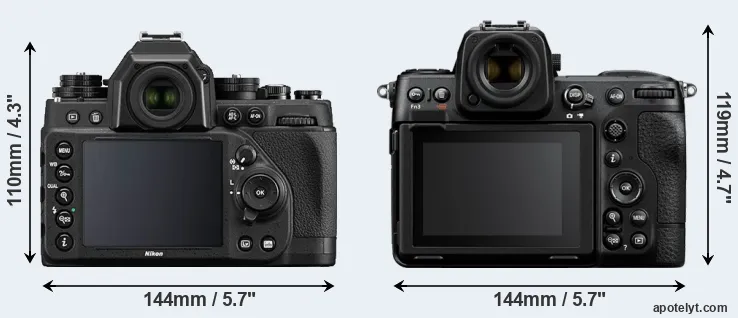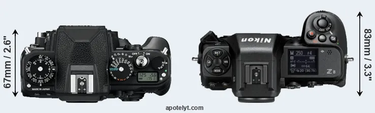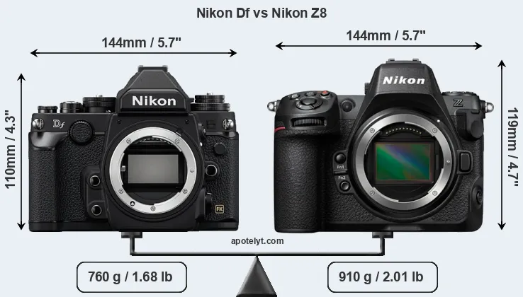 The side-by-side display below illustrates the physical size and weight of the Nikon Df and the Nikon Z8. The two cameras are presented according to their relative size. Three successive views from the front, the top, and the rear are shown. All width, height and depth dimensions are rounded to the nearest millimeter.