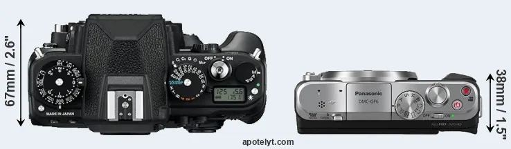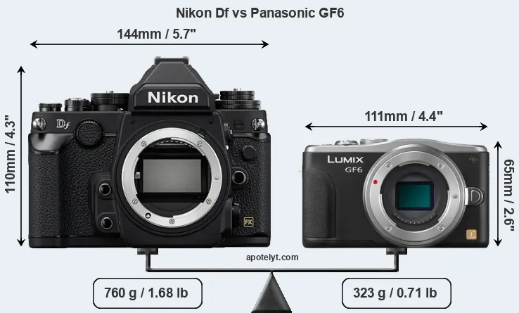 The physical size and weight of the Nikon Df and the Panasonic GF6 are illustrated in the side-by-side display below. The two cameras are presented according to their relative size. Three successive views from the front, the top, and the rear are shown. All size dimensions are rounded to the nearest millimeter.