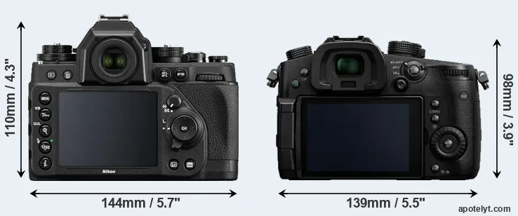 The physical size and weight of the Nikon Df and the Panasonic GH5 are illustrated in the side-by-side display below. The two cameras are presented according to their relative size. Three consecutive perspectives from the front, the top, and the back are available. All size dimensions are rounded to the nearest millimeter.