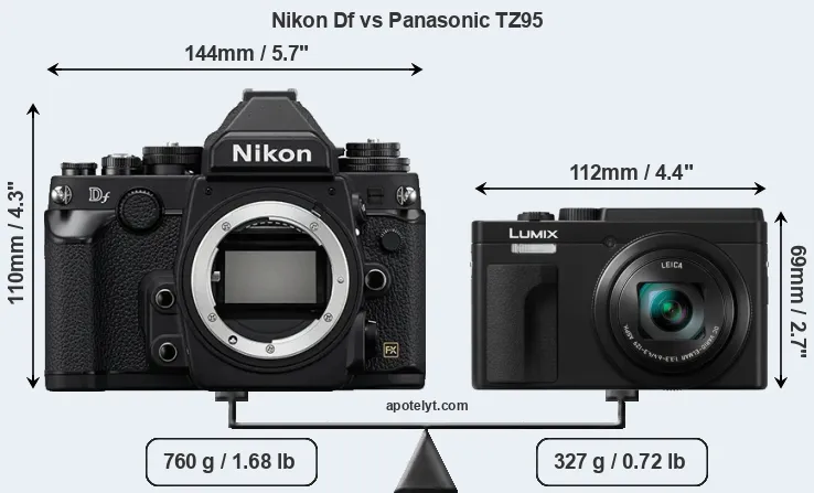 If the front view area (width x height) of the cameras is taken as an aggregate measure of their size, the Panasonic TZ95 is considerably smaller (51 percent) than the Nikon Df. It is worth mentioning in this context that the Df is splash and dust resistant, while the TZ95 does not feature any corresponding weather-sealing.