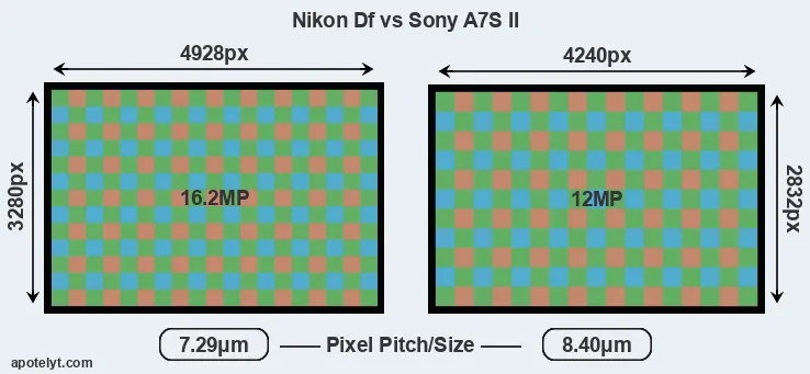 With 16.2MP, the Df offers a higher resolution than the A7S II (12MP), but the Df has smaller individual pixels (pixel pitch of 7.29μm versus 8.40μm for the A7S II). Moreover, the A7S II is a somewhat more recent model (by 1 year and 10 months) than the Df, and its sensor might have benefitted from technological advances during this time that further enhance the light gathering capacity of its pixels.