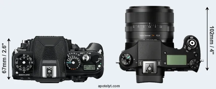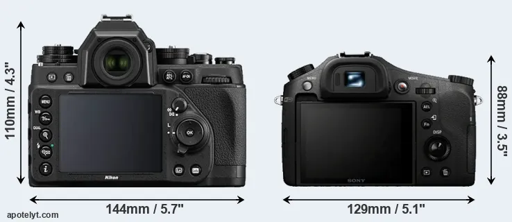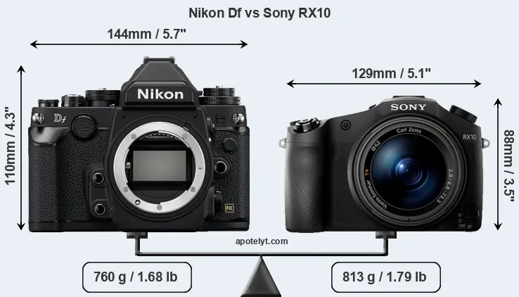 The side-by-side display below illustrates the physical size and weight of the Nikon Df and the Sony RX10. The two cameras are presented according to their relative size. Three consecutive views from the front, the top, and the rear side are shown. All width, height and depth dimensions are rounded to the nearest millimeter.