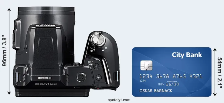 The side-by-side display below illustrates the physical size of the Nikon L840 vis-à-vis a credit card. Three consecutive perspectives from the front, the top, and the back are presented. All width, height and depth measures are rounded to the nearest millimeter.