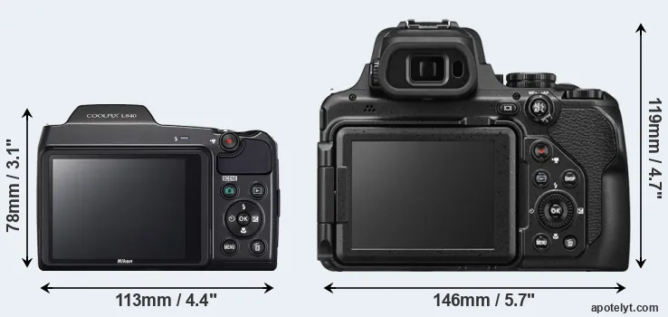 An illustration of the physical size and weight of the Nikon L840 and the Nikon P1100 is provided in the side-by-side display below. The two cameras are presented according to their relative size. Three successive views from the front, the top, and the rear are shown. All width, height and depth dimensions are rounded to the nearest millimeter.