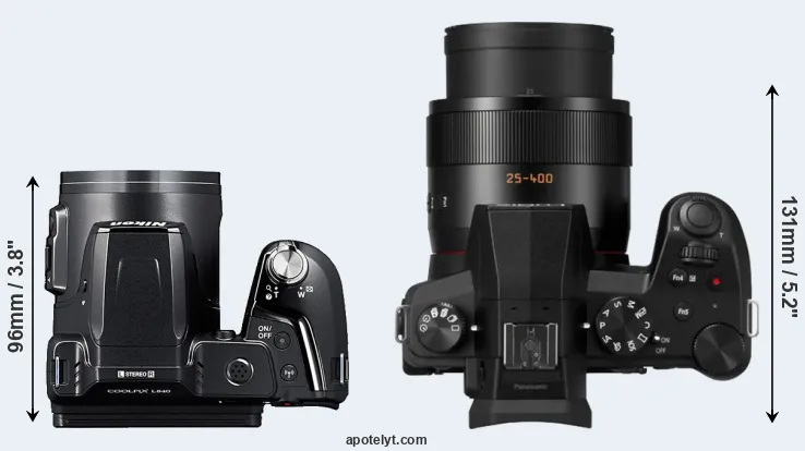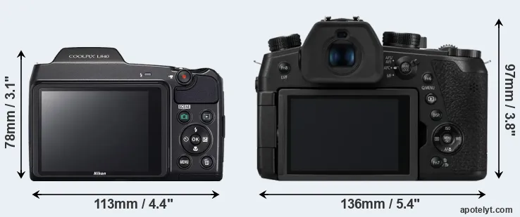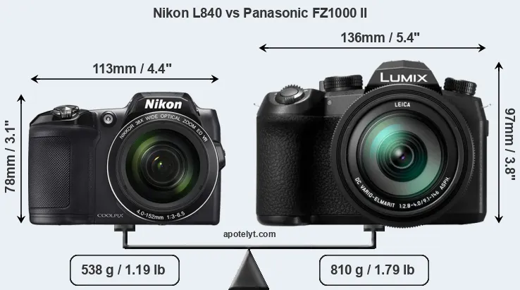 The side-by-side display below illustrates the physical size and weight of the Nikon L840 and the Panasonic FZ1000 II. The two cameras are presented according to their relative size. Three consecutive perspectives from the front, the top, and the back are available. All width, height and depth dimensions are rounded to the nearest millimeter.