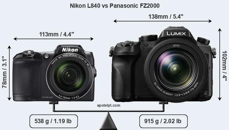 The physical size and weight of the Nikon L840 and the Panasonic FZ2000 are illustrated in the side-by-side display below. The two cameras are presented according to their relative size. Three successive views from the front, the top, and the rear are shown. All width, height and depth measures are rounded to the nearest millimeter.