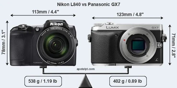 The side-by-side display below illustrates the physical size and weight of the Nikon L840 and the Panasonic GX7. The two cameras are presented according to their relative size. Three consecutive views from the front, the top, and the rear side are shown. All width, height and depth dimensions are rounded to the nearest millimeter.