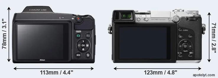 If the front view area (width x height) of the cameras is taken as an aggregate measure of their size, the Nikon L840 and the Panasonic GX7 are of equal size. In this context, it is worth noting that neither the L840 nor the GX7 are weather-sealed.