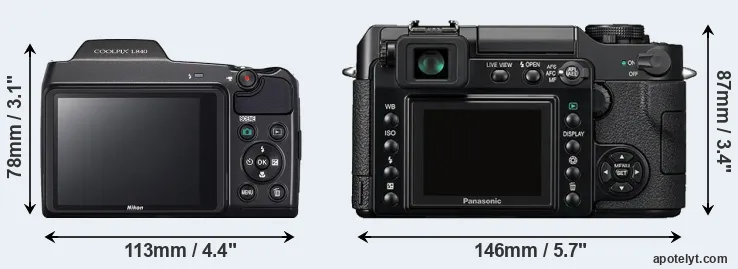 If the front view area (width x height) of the cameras is taken as an aggregate measure of their size, the Panasonic L1 is considerably larger (44 percent) than the Nikon L840. In this context, it is worth noting that neither the L840 nor the L1 are weather-sealed.