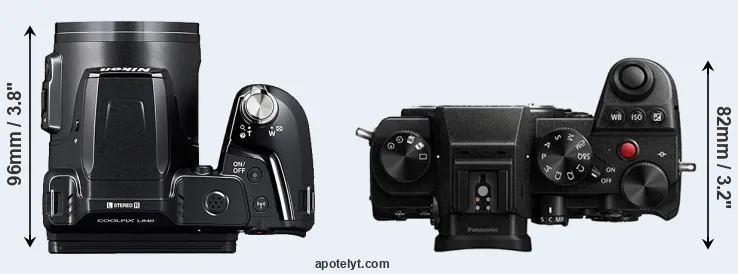 If the front view area (width x height) of the cameras is taken as an aggregate measure of their size, the Panasonic S5 is considerably larger (48 percent) than the Nikon L840. It is noteworthy in this context that the S5 is splash and dust-proof, while the L840 does not feature any corresponding weather-sealing.