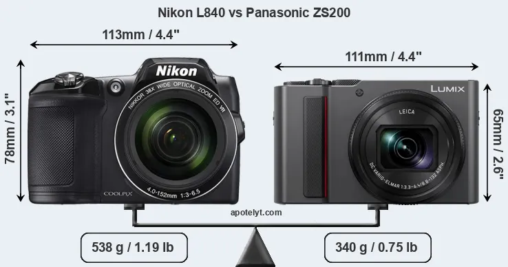 An illustration of the physical size and weight of the Nikon L840 and the Panasonic ZS200 is provided in the side-by-side display below. The two cameras are presented according to their relative size. Three successive views from the front, the top, and the rear are shown. All width, height and depth measures are rounded to the nearest millimeter.