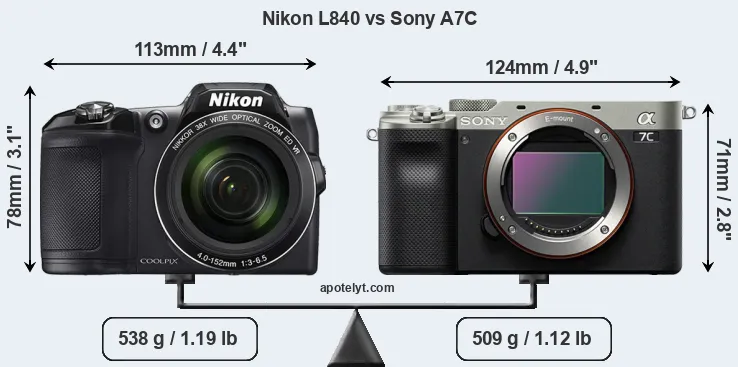 An illustration of the physical size and weight of the Nikon L840 and the Sony A7C is provided in the side-by-side display below. The two cameras are presented according to their relative size. Three consecutive perspectives from the front, the top, and the back are available. All width, height and depth measures are rounded to the nearest millimeter.