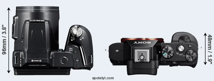 The side-by-side display below illustrates the physical size and weight of the Nikon L840 and the Sony A7R. The two cameras are presented according to their relative size. Three successive views from the front, the top, and the rear are shown. All size dimensions are rounded to the nearest millimeter.