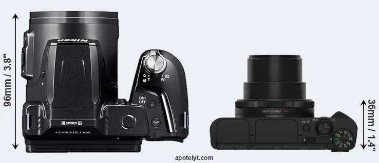 The side-by-side display below illustrates the physical size and weight of the Nikon L840 and the Sony HX90V. The two cameras are presented according to their relative size. Three successive views from the front, the top, and the rear are shown. All width, height and depth measures are rounded to the nearest millimeter.