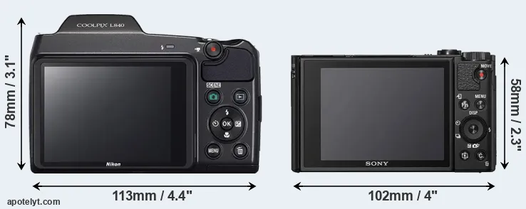The side-by-side display below illustrates the physical size and weight of the Nikon L840 and the Sony HX95. The two cameras are presented according to their relative size. Three successive views from the front, the top, and the rear are shown. All width, height and depth measures are rounded to the nearest millimeter.