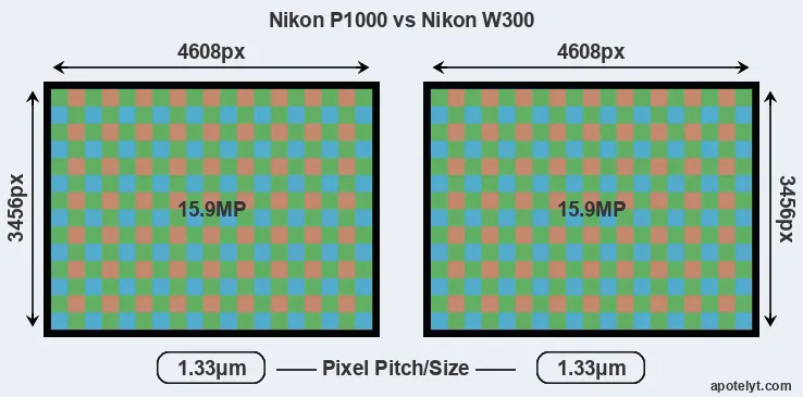 | Sensor Specs | Nikon P1000 | Nikon W300 |