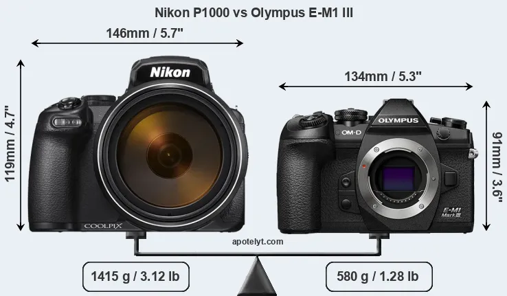 The side-by-side display below illustrates the physical size and weight of the Nikon P1000 and the Olympus E-M1 III. The two cameras are presented according to their relative size. Three consecutive views from the front, the top, and the rear side are shown. All width, height and depth measures are rounded to the nearest millimeter.