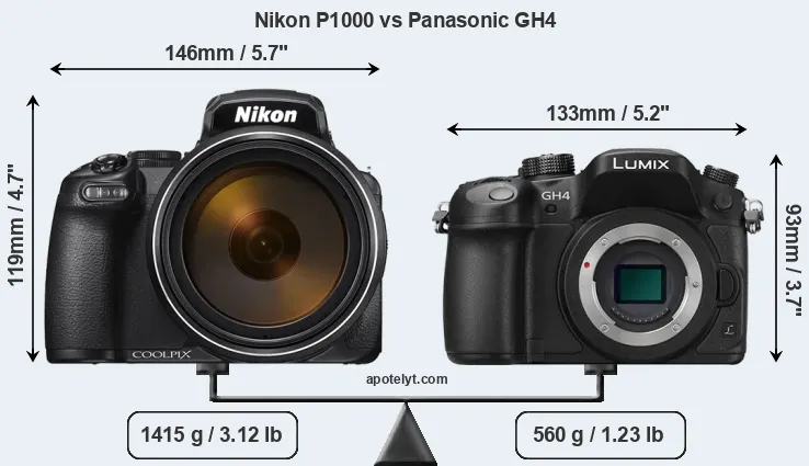 An illustration of the physical size and weight of the Nikon P1000 and the Panasonic GH4 is provided in the side-by-side display below. The two cameras are presented according to their relative size. Three consecutive perspectives from the front, the top, and the back are available. All size dimensions are rounded to the nearest millimeter.
