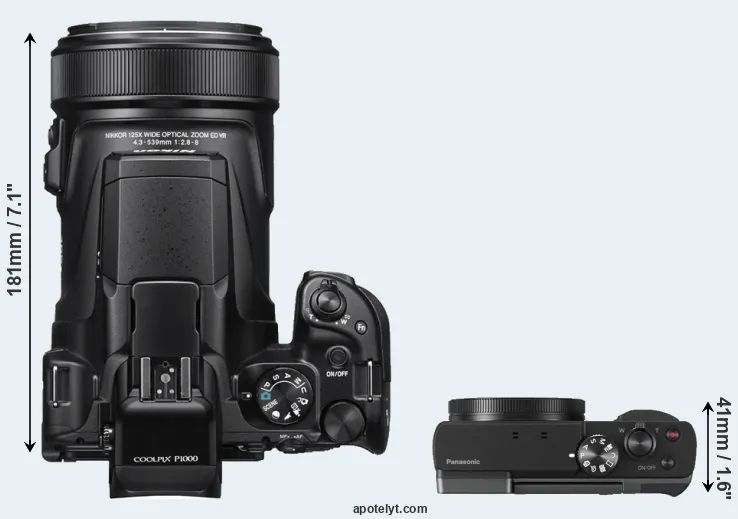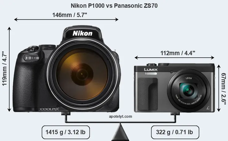 The side-by-side display below illustrates the physical size and weight of the Nikon P1000 and the Panasonic ZS70. The two cameras are presented according to their relative size. Three consecutive perspectives from the front, the top, and the back are available. All width, height and depth measures are rounded to the nearest millimeter.