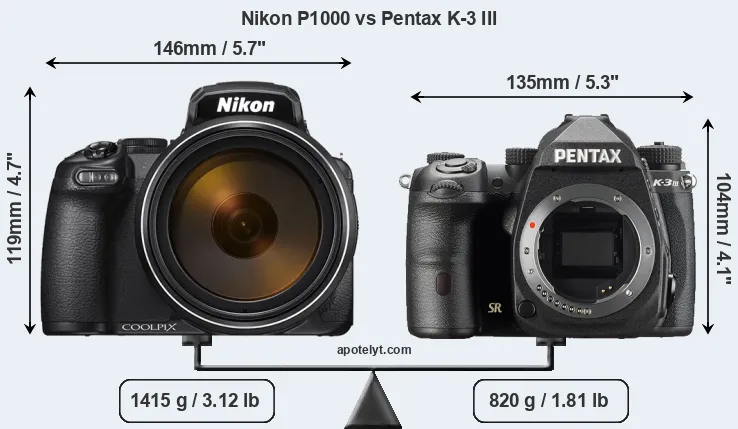 An illustration of the physical size and weight of the Nikon P1000 and the Pentax K-3 III is provided in the side-by-side display below. The two cameras are presented according to their relative size. Three consecutive views from the front, the top, and the rear side are shown. All width, height and depth measures are rounded to the nearest millimeter.