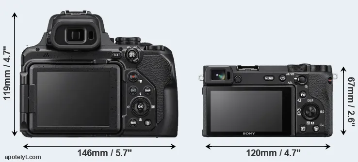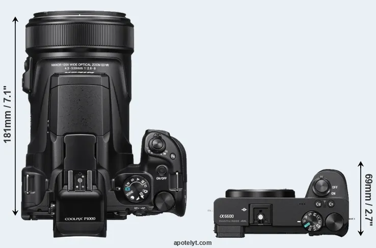 The side-by-side display below illustrates the physical size and weight of the Nikon P1000 and the Sony A6600. The two cameras are presented according to their relative size. Three successive views from the front, the top, and the rear are shown. All size dimensions are rounded to the nearest millimeter.