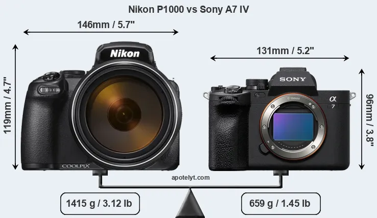 An illustration of the physical size and weight of the Nikon P1000 and the Sony A7 IV is provided in the side-by-side display below. The two cameras are presented according to their relative size. Three consecutive perspectives from the front, the top, and the back are available. All width, height and depth measures are rounded to the nearest millimeter.