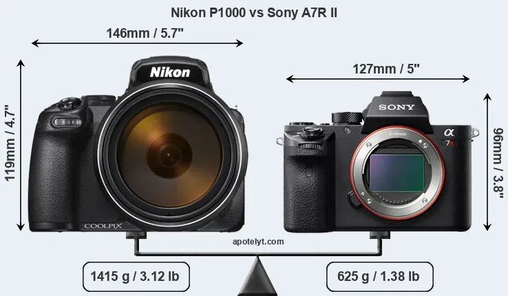 An illustration of the physical size and weight of the Nikon P1000 and the Sony A7R II is provided in the side-by-side display below. The two cameras are presented according to their relative size. Three successive views from the front, the top, and the rear are shown. All width, height and depth dimensions are rounded to the nearest millimeter.