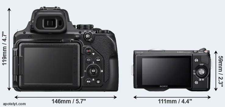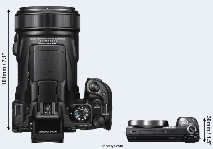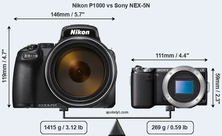 The side-by-side display below illustrates the physical size and weight of the Nikon P1000 and the Sony NEX-5N. The two cameras are presented according to their relative size. Three consecutive perspectives from the front, the top, and the back are available. All width, height and depth dimensions are rounded to the nearest millimeter.