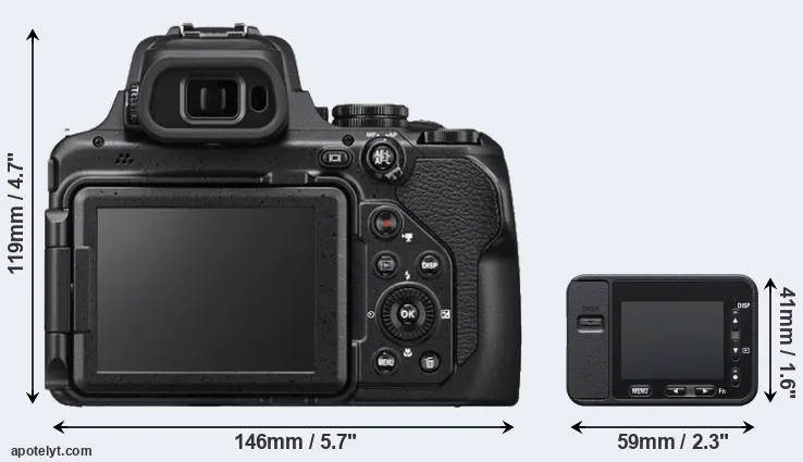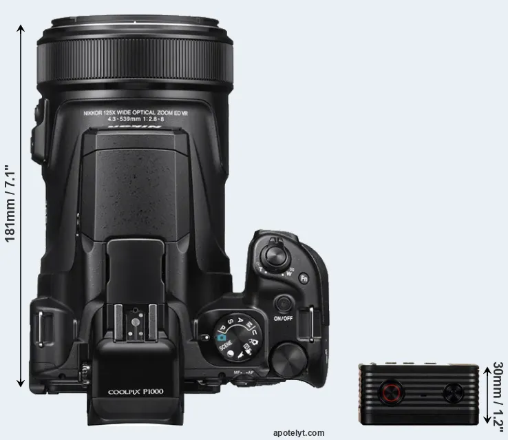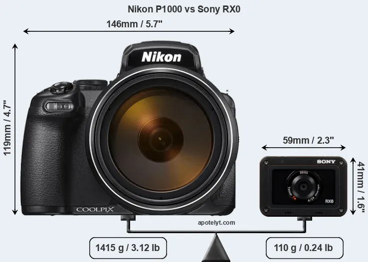 The side-by-side display below illustrates the physical size and weight of the Nikon P1000 and the Sony RX0. The two cameras are presented according to their relative size. Three consecutive perspectives from the front, the top, and the back are available. All size dimensions are rounded to the nearest millimeter.