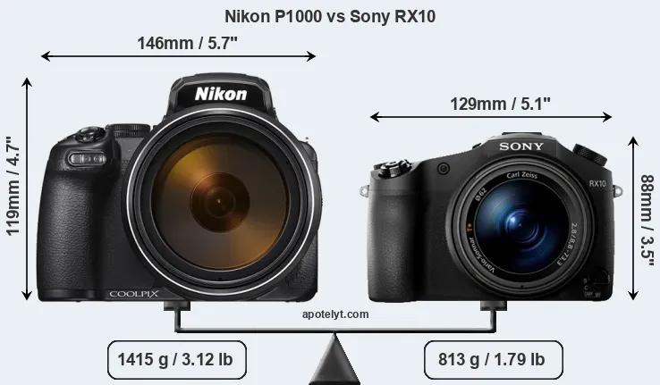 An illustration of the physical size and weight of the Nikon P1000 and the Sony RX10 is provided in the side-by-side display below. The two cameras are presented according to their relative size. Three successive views from the front, the top, and the rear are shown. All width, height and depth dimensions are rounded to the nearest millimeter.