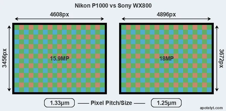 While the two cameras under review share the same sensor size, the WX800 offers a higher resolution of 18 megapixels, compared with 15.9 MP of the P1000. This megapixels advantage translates into a 6 percent gain in linear resolution. On the other hand, these sensor specs imply that the WX800 has a higher pixel density and a smaller size of the individual pixel (with a pixel pitch of 1.25μm versus 1.33μm for the P1000). However, it should be noted that the WX800 is a somewhat more recent model (by 3 months) than the P1000, and its sensor might have benefitted from technological advances during this time that at least partly compensate for the smaller pixel size. Coming back to sensor resolution, it should be mentioned that neither of the two cameras has an anti-alias filter installed, so they are able to capture all the detail the sensor resolves.