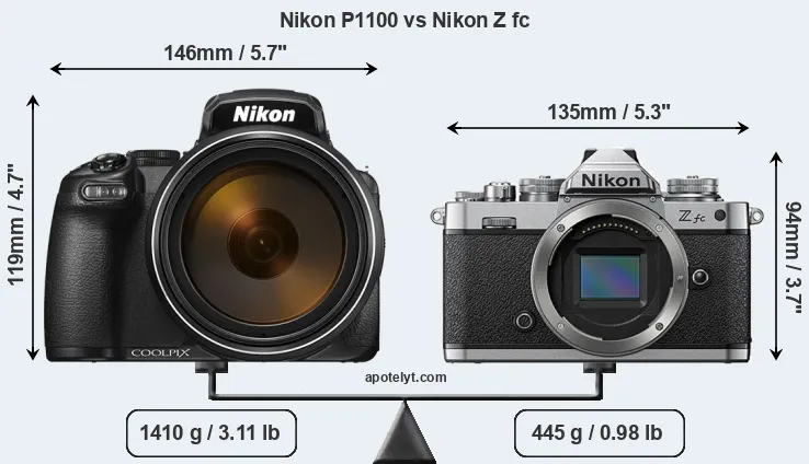The Nikon Coolpix P1100 and the Nikon Z fc are two digital cameras that were revealed to the public, respectively, in February 2025 and June 2021. The P1100 is a fixed lens compact, while the Z fc is a mirrorless interchangeable lens camera. The cameras are based on a 1/2.3-inch (P1100) and an APS-C (Z fc) sensor. The P1100 has a resolution of 15.9 megapixels, whereas the Z fc provides 20.7 MP.