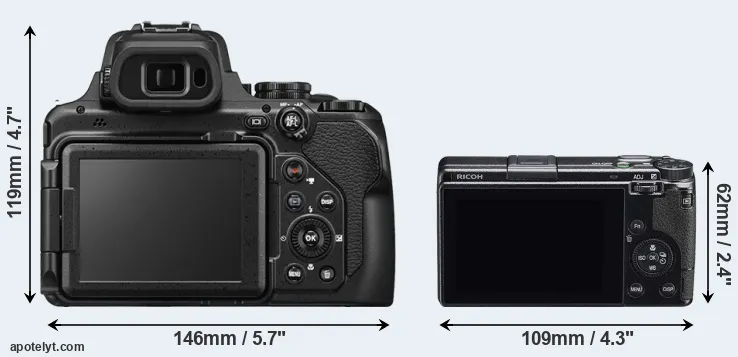 The side-by-side display below illustrates the physical size and weight of the Nikon P1100 and the Ricoh GR IIIx. The two cameras are presented according to their relative size. Three successive views from the front, the top, and the rear are shown. All size dimensions are rounded to the nearest millimeter.