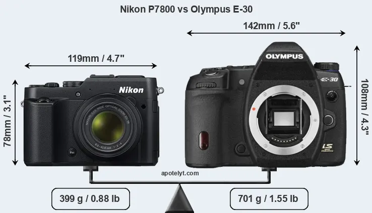 If the front view area (width x height) of the cameras is taken as an aggregate measure of their size, the Olympus E-30 is considerably larger (65 percent) than the Nikon P7800. In this context, it is worth noting that neither the P7800 nor the E-30 are weather-sealed.
