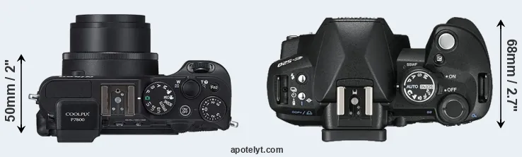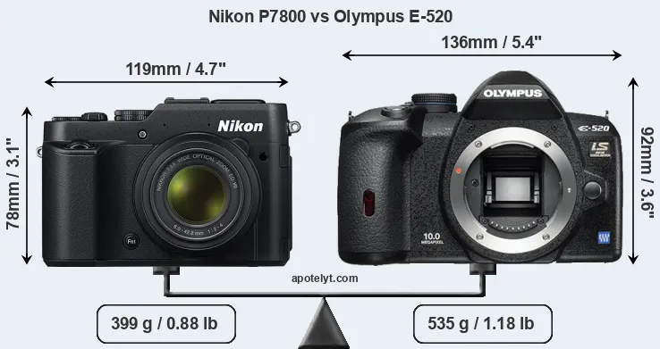 The side-by-side display below illustrates the physical size and weight of the Nikon P7800 and the Olympus E-520. The two cameras are presented according to their relative size. Three consecutive perspectives from the front, the top, and the back are available. All width, height and depth measures are rounded to the nearest millimeter.