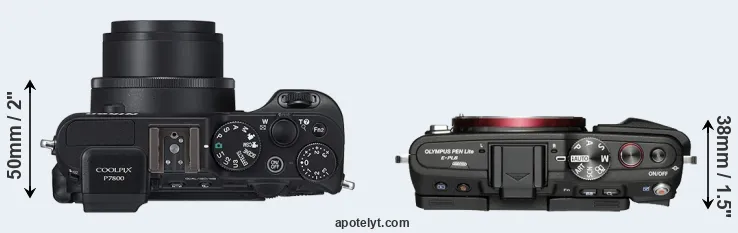 The side-by-side display below illustrates the physical size and weight of the Nikon P7800 and the Olympus E-PL6. The two cameras are presented according to their relative size. Three successive views from the front, the top, and the rear are shown. All width, height and depth dimensions are rounded to the nearest millimeter.
