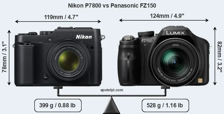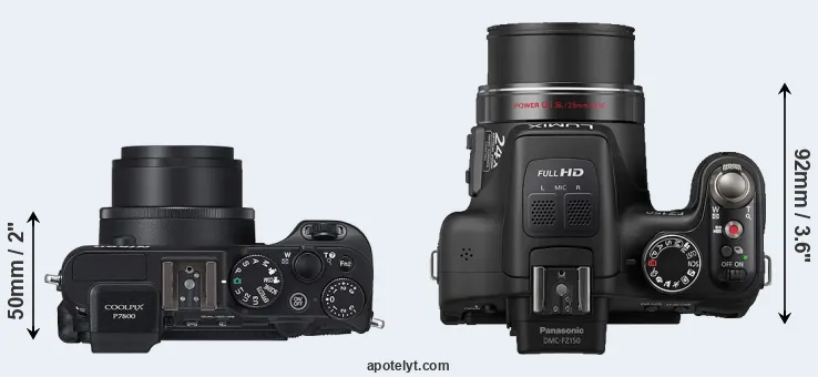 The physical size and weight of the Nikon P7800 and the Panasonic FZ150 are illustrated in the side-by-side display below. The two cameras are presented according to their relative size. Three consecutive perspectives from the front, the top, and the back are available. All width, height and depth measures are rounded to the nearest millimeter.