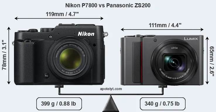 The side-by-side display below illustrates the physical size and weight of the Nikon P7800 and the Panasonic ZS200. The two cameras are presented according to their relative size. Three successive views from the front, the top, and the rear are shown. All width, height and depth measures are rounded to the nearest millimeter.