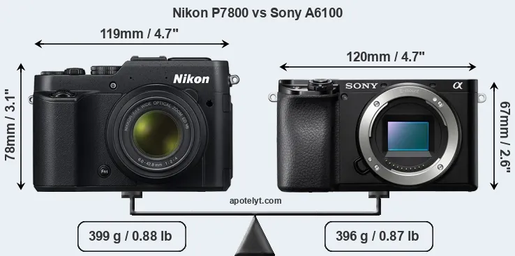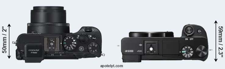 The physical size and weight of the Nikon P7800 and the Sony A6100 are illustrated in the side-by-side display below. The two cameras are presented according to their relative size. Three consecutive perspectives from the front, the top, and the back are available. All width, height and depth dimensions are rounded to the nearest millimeter.