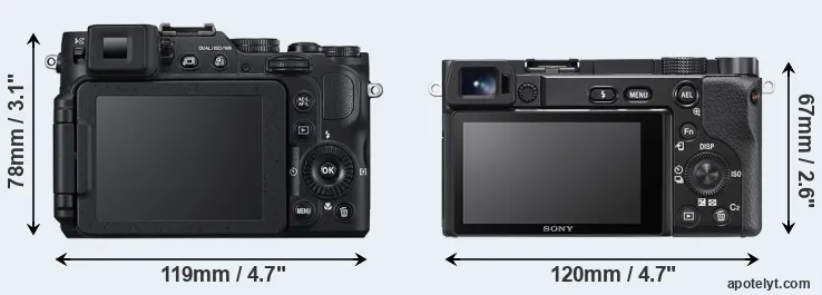 If the front view area (width x height) of the cameras is taken as an aggregate measure of their size, the Sony A6100 is notably smaller (13 percent) than the Nikon P7800. In this context, it is worth noting that neither the P7800 nor the A6100 are weather-sealed.