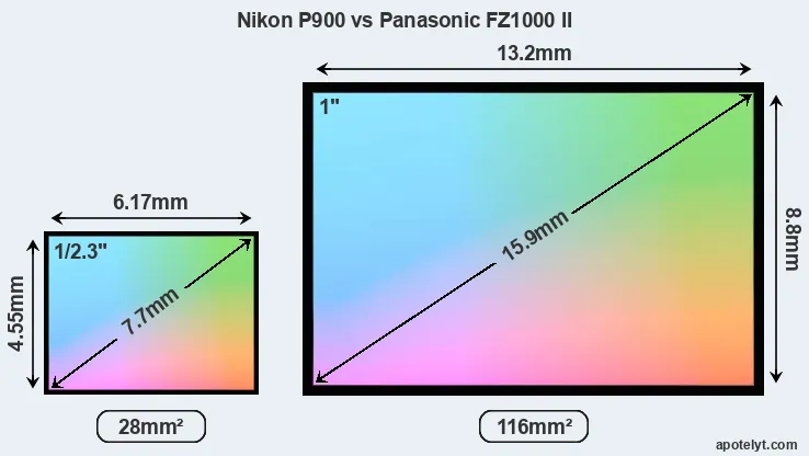 Of the two cameras under consideration, the Nikon P900 features a 1/2.3-inch sensor and the Panasonic FZ1000 II an one-inch sensor. The sensor area in the FZ1000 II is 314 percent bigger. As a result of these sensor size differences, the cameras have a format factor of, respectively, 5.6 and 2.7. The sensor in the P900 has a native 4:3 aspect ratio, while the one in the FZ1000 II offers a 3:2 aspect.