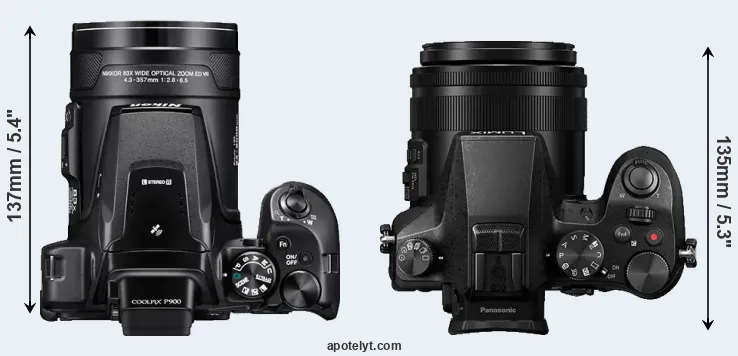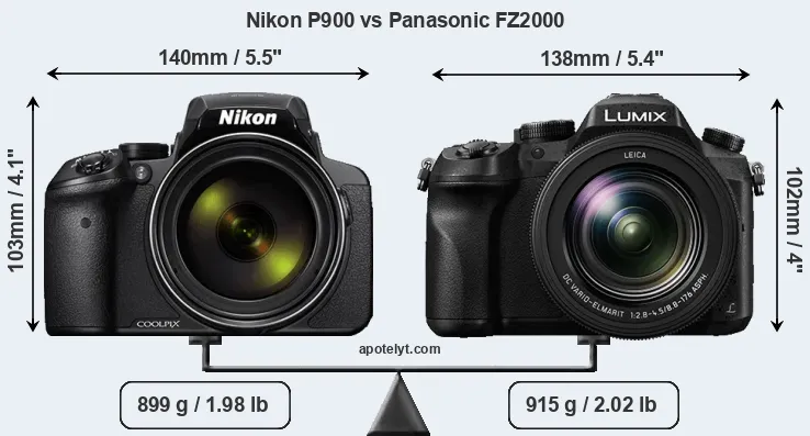 The side-by-side display below illustrates the physical size and weight of the Nikon P900 and the Panasonic FZ2000. The two cameras are presented according to their relative size. Three consecutive views from the front, the top, and the rear side are shown. All width, height and depth dimensions are rounded to the nearest millimeter.