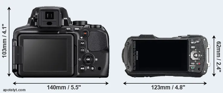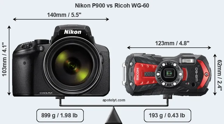 An illustration of the physical size and weight of the Nikon P900 and the Ricoh WG-60 is provided in the side-by-side display below. The two cameras are presented according to their relative size. Three successive views from the front, the top, and the rear are shown. All width, height and depth dimensions are rounded to the nearest millimeter.